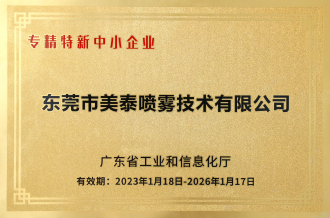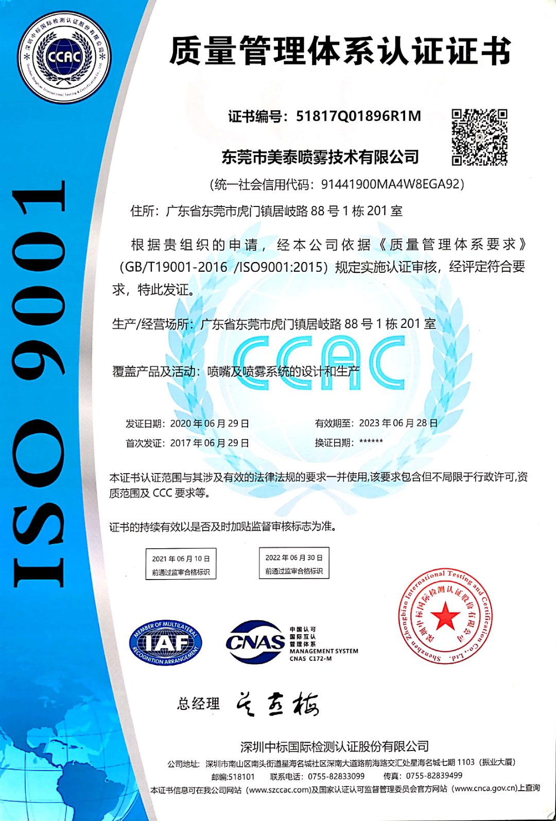 東莞市美泰噴霧技術(shù)有限公司 是一家噴霧領(lǐng)域的專業(yè)制造廠家,專業(yè)從事工業(yè)噴嘴及噴霧系統(tǒng)的研發(fā)、設(shè)計(jì)、制作和銷售。目前公司擁有工業(yè)廠房面積4000平米,固定資產(chǎn)1000多萬,建立起完備的開發(fā)、生產(chǎn)和品質(zhì)管理體系。公司通過了ISO 9001:2015和ISO 14001:2015認(rèn)證,并獲得國家高新企業(yè)技術(shù)認(rèn)定。 我們的產(chǎn)品供應(yīng)全球客戶,并以優(yōu)良的品質(zhì),精湛的技藝,良好的服務(wù),具有競爭力的價(jià)格贏得了廣大客戶的認(rèn)可。