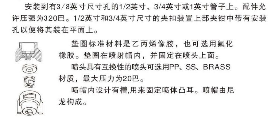 2:噴頭具有互換性的噴頭可選用PP、SS、BRASS材質(zhì),最大壓力為20巴。