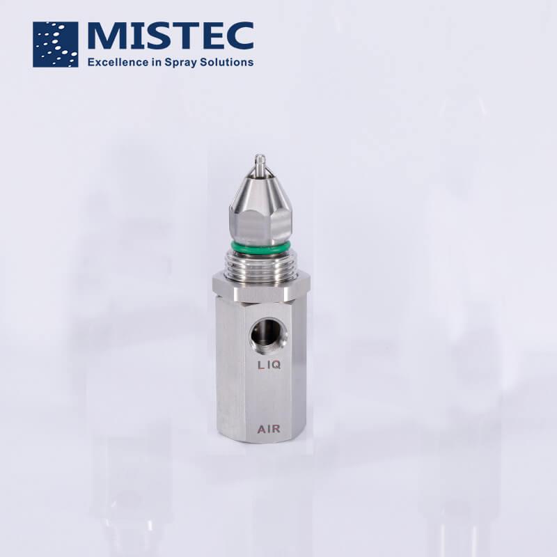 液體和壓縮空氣在噴嘴內(nèi)部混合,再經(jīng)由緊密的機(jī)械超聲振子(也稱為超聲波發(fā)生器)再次霧化,產(chǎn)生極細(xì)的噴霧顆粒。