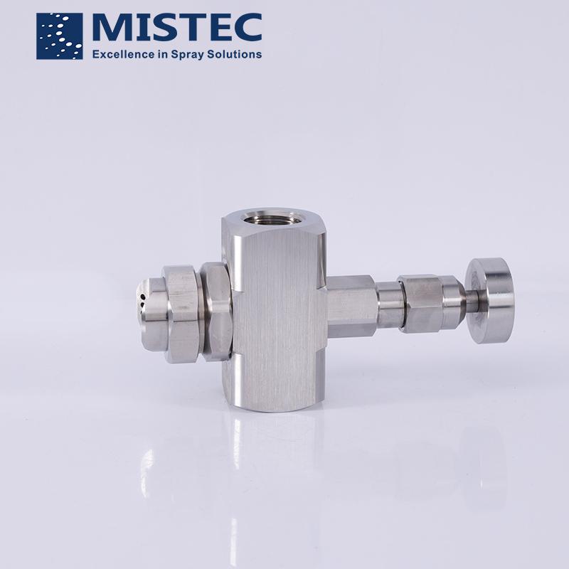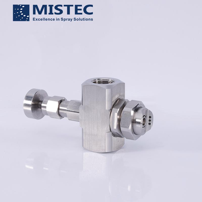 壓縮空氣和水在噴嘴外部混合,形成扇形噴霧,顆粒很細。