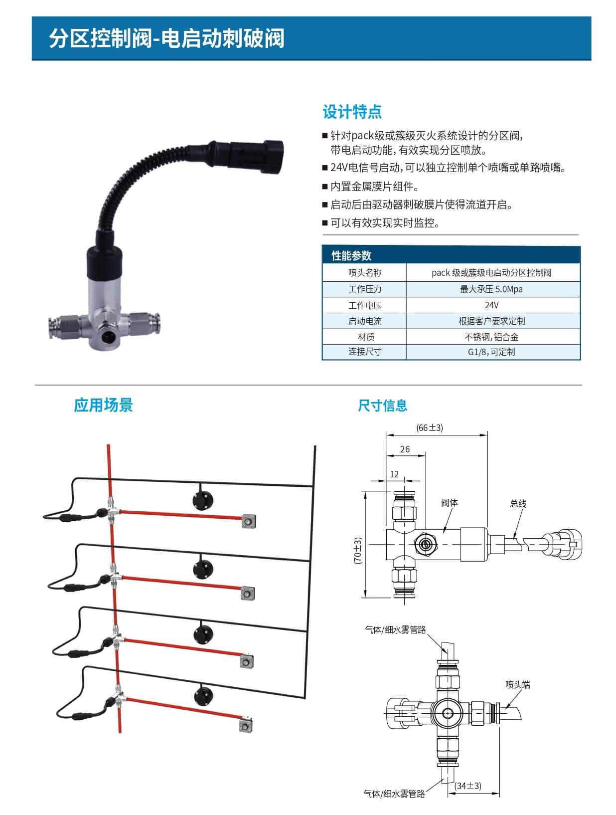 1. 針對pack級或簇級滅火系統(tǒng)設計的分區(qū)閥,帶電啟動功能,有效實現(xiàn)分區(qū)噴放。